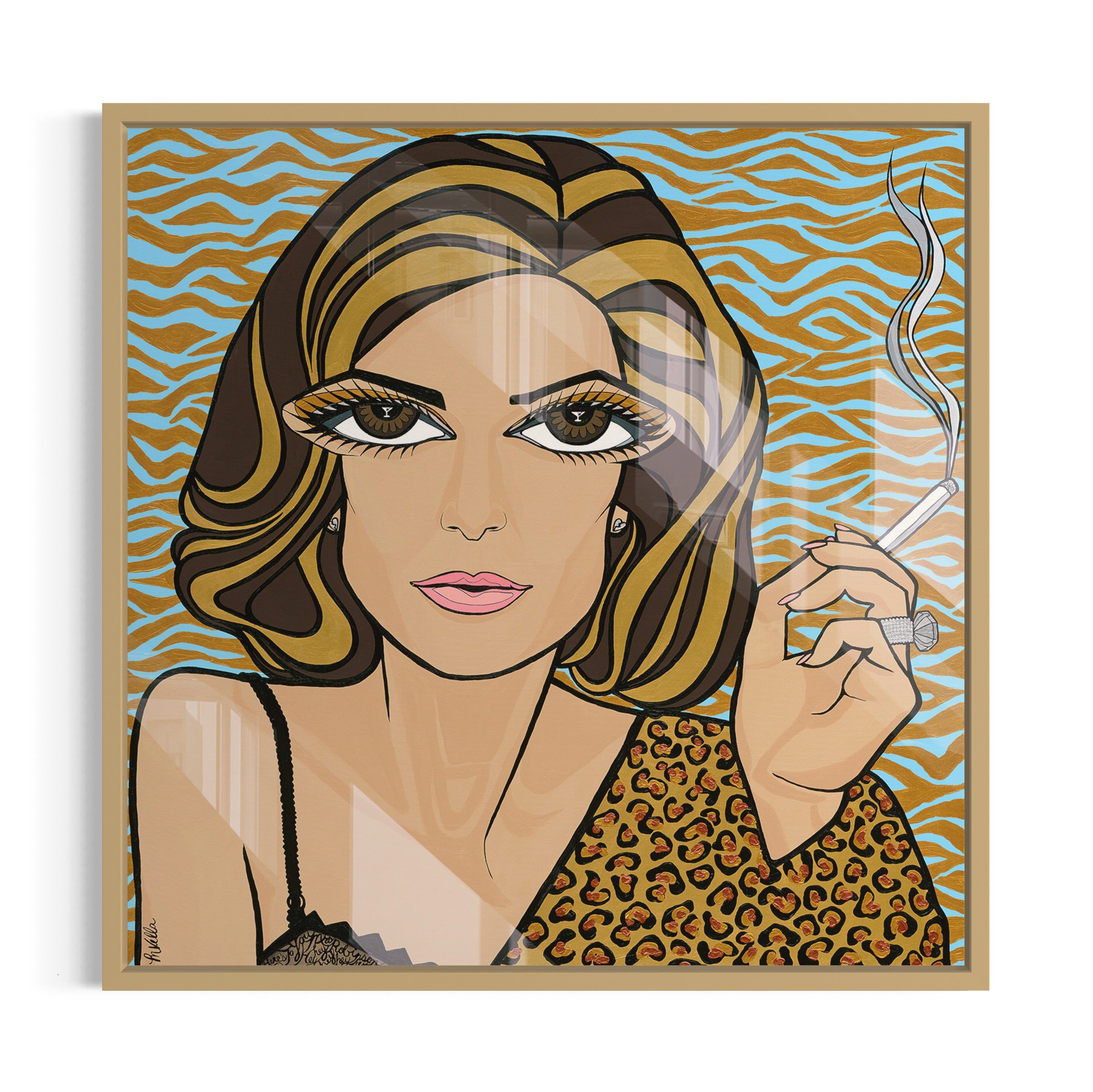 Pop art portrait painting of The Graduate's Mrs. Robinson played by Ann Bancroft portrayed seductively holding a cigarette, wearing lingerie and leopard print shawl, painted in metallic gold colors with a animal print background in blue and gold