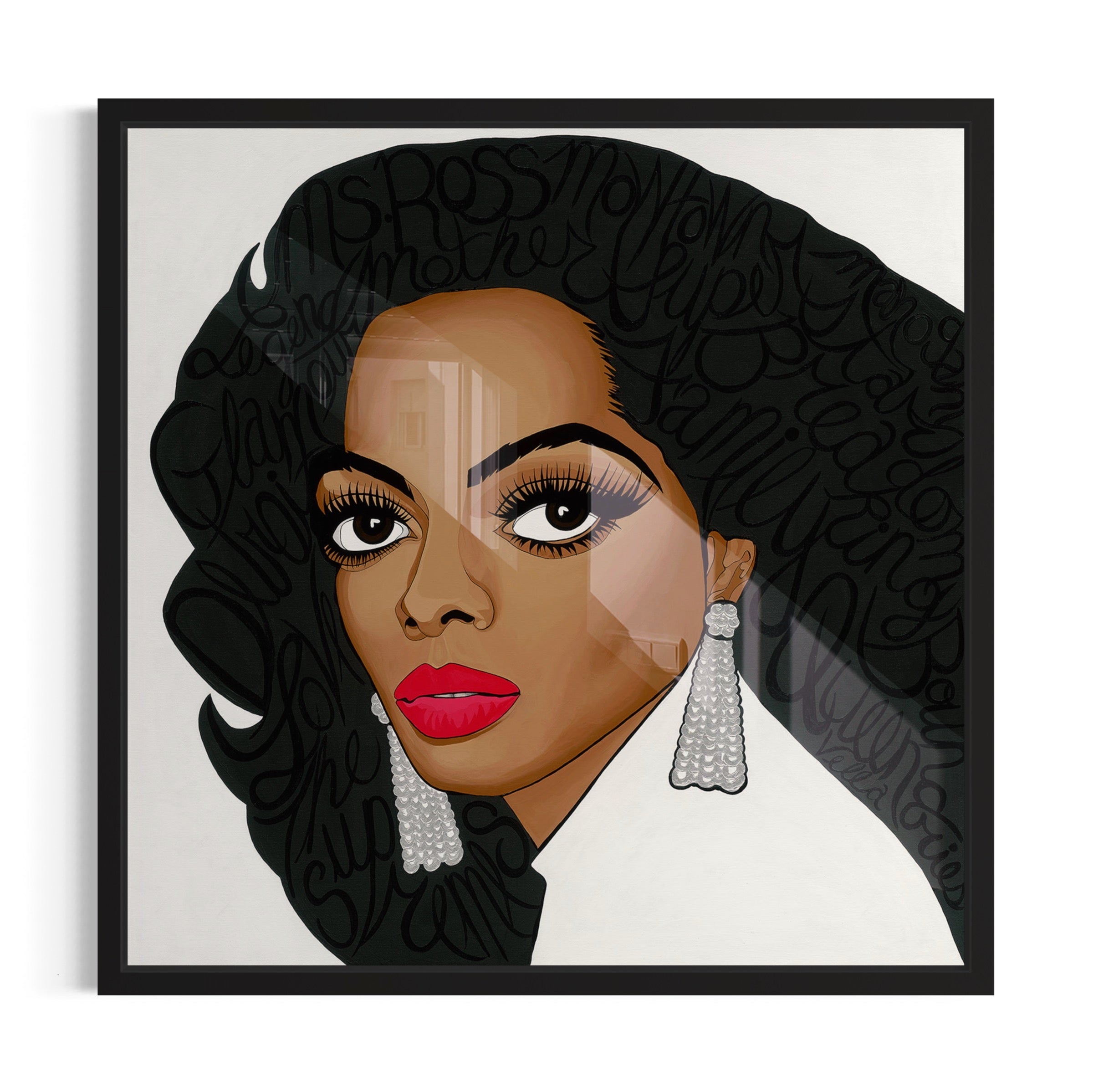 Ms. Ross I've poured my heart into capturing the enduring spirit and magnetic presence of the iconic Diana Ross. This piece is my tribute to her—a celebration of the allure that she embodies and a reflection of her timeless elegance. With each brushstroke, I've strived to encapsulate her dynamic essence and the resonance of her music and style that continue to transcend time. My signature big-eyes magnifies her expressive soul, while the descriptive words, intertwined in her hair, highlight the profound impact of her legacy. This painting is more than a visual likeness; it's a conversation with history, an intimate encounter with greatness, and my artistic bow to the diva who has inspired so many, including myself.