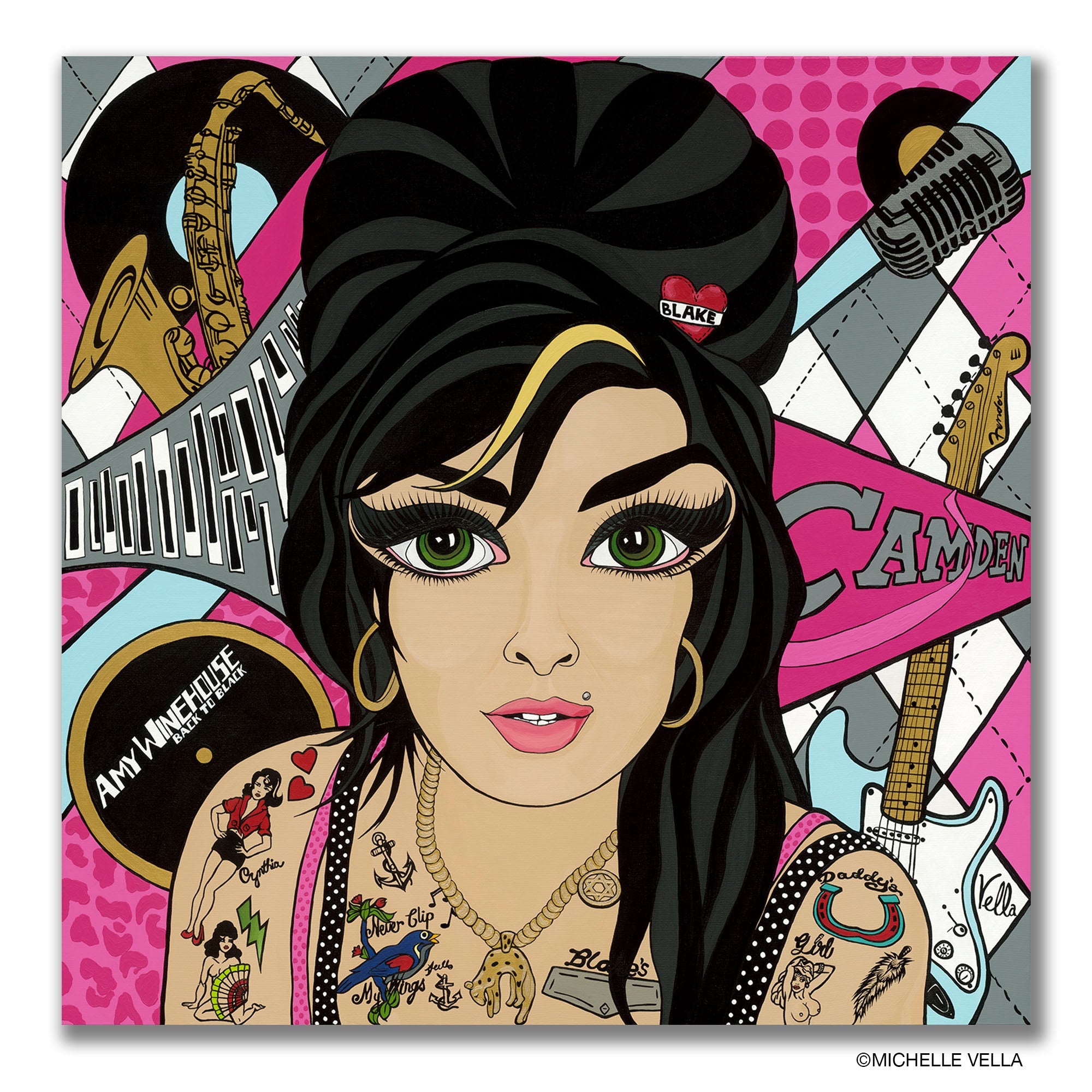 I painted this portrait of Amy Winehouse as a vibrant celebration of her iconic style and incredible legacy. Her expressive eyes take center stage, pulling you into her world, her favorite colors—pinks and light blue, while the bold details—like her signature tattoos, beehive hair, and winged eyeliner—pay homage to her unforgettable look. The backdrop is inspired by her roots in Camden Town and her deep connection to music, with visual nods to her jazz influences and electrifying performances. Through my signature big eyes style, I aimed to capture Amy's soulful energy and raw emotion, creating a piece that honors her individuality and timeless artistry.
