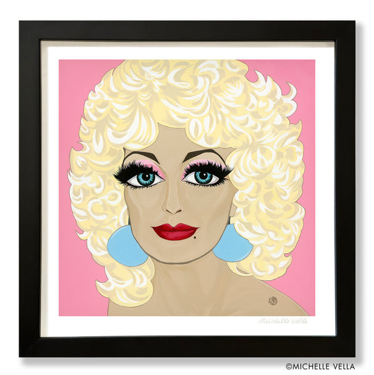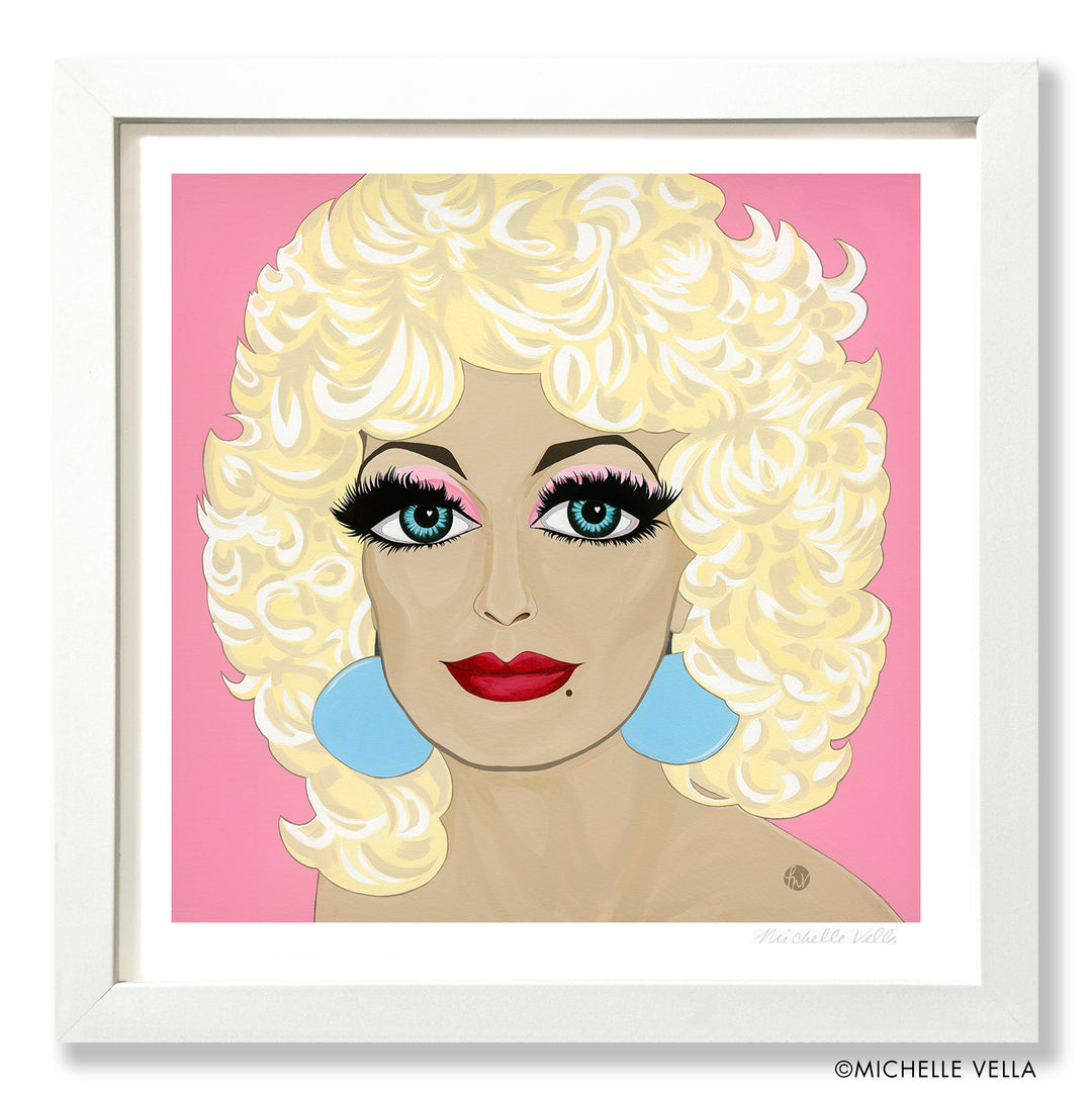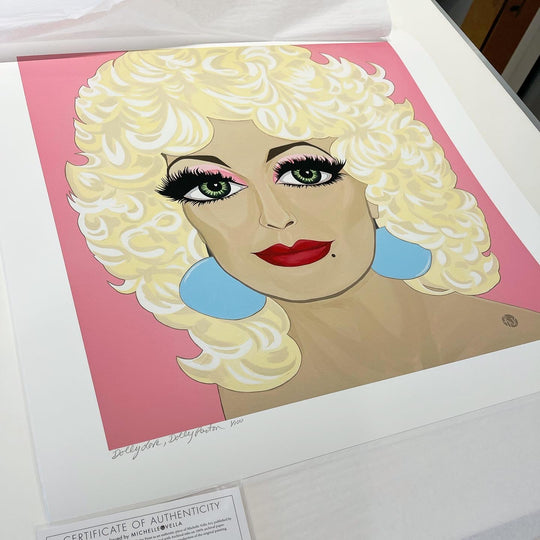Being commissioned to paint Dolly Parton in the style of Andy Warhol’s iconic portrait was an exciting challenge. In my original version, I painted her eyes green, inspired by Warhol’s vibrant depiction and as a nod to the 'emerald green eyes' famously associated with the character Jolene from her iconic song. For this special Limited Edition print version, I stayed true to Dolly’s natural blue eyes while maintaining the bold, pop art aesthetic. Her striking features—golden curls, dramatic lashes, signature red lips, and the playful pink background—capture her larger-than-life personality. This portrait celebrates Dolly’s timeless glamour, blending Warhol’s influence with my own big-eye style.