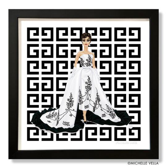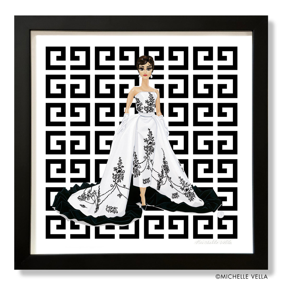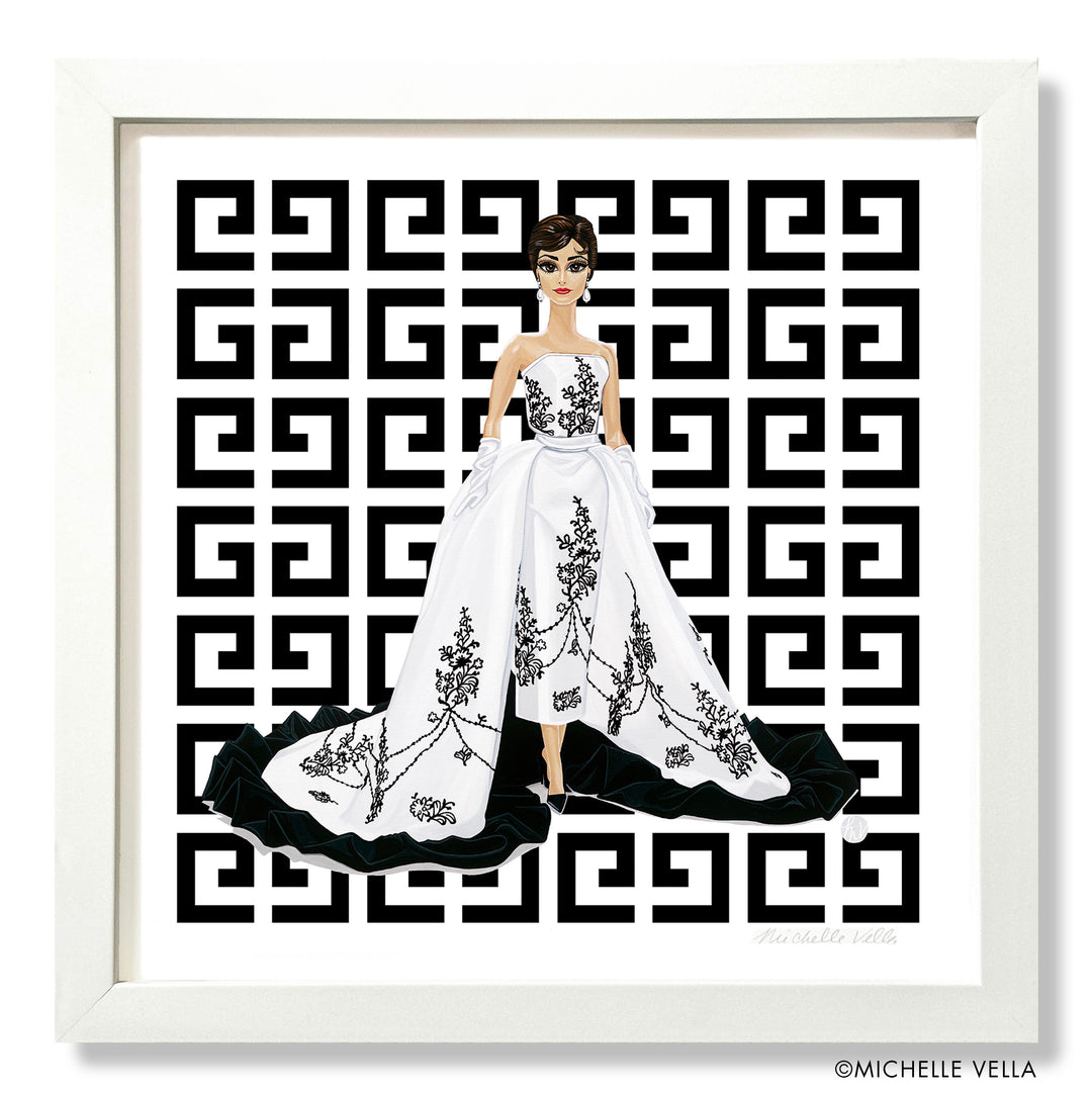 Pop art portrait painting of Audrey Hepburn as Sabrina from the movie Sabrina, wearing Givenchy haute couture B&W gown and the Givenchy logo pattern repeated in the background in black on white