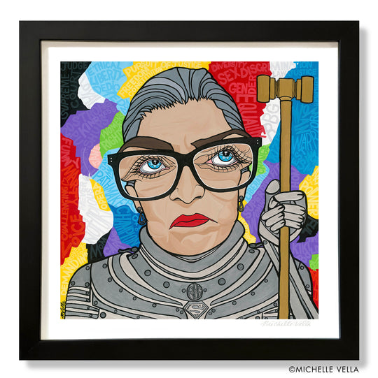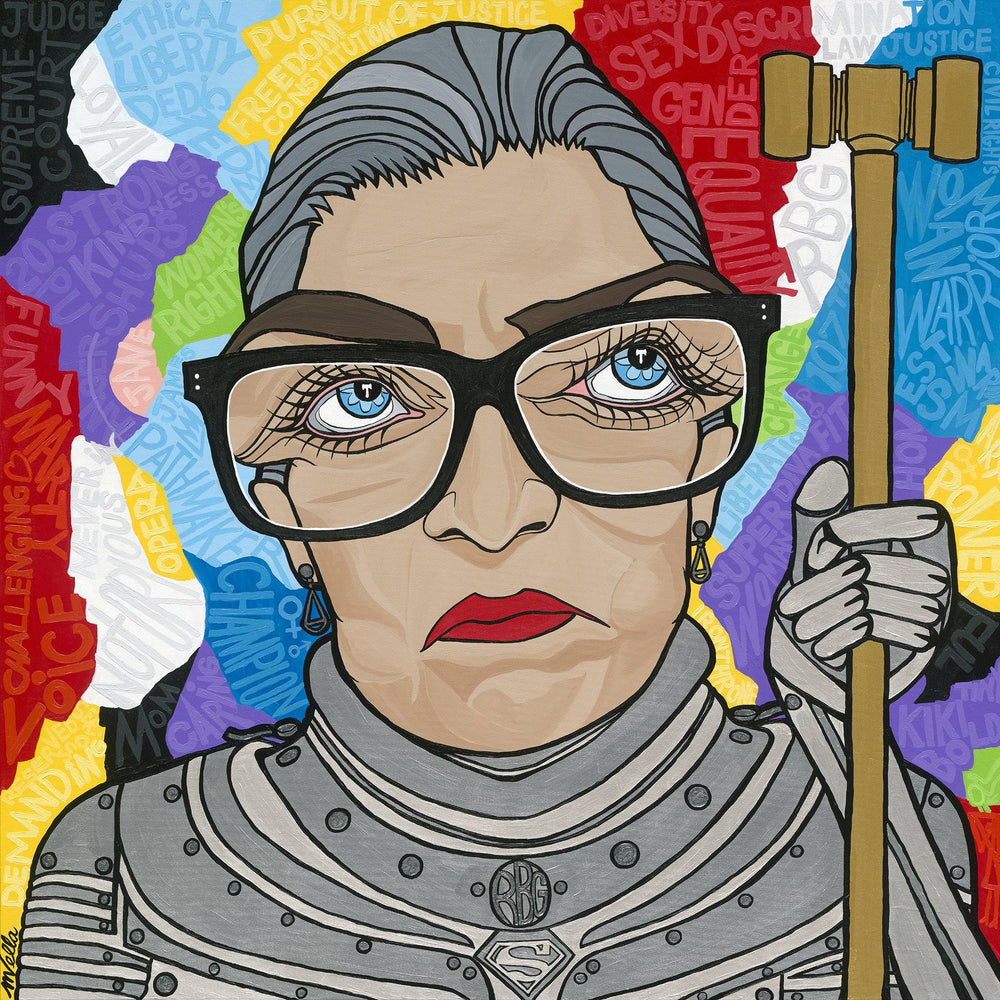 Pop art portrait painting of The Notorious RBG, Ruth Bader Ginsberg with big blue eyes, wearing black rimmed glasses and a superwoman armoured suit holding a tall gavel with word about her written into a colorful background