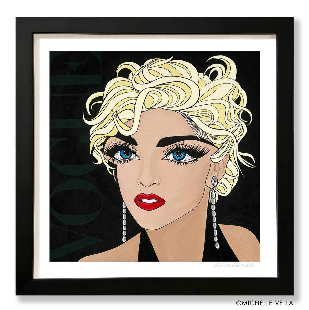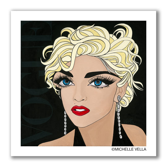 In this painting, I aimed to portray Madonna from her "Vogue" era with a modern twist. I used sharp black outlines to bring out her features against the contrasting colors. The composition is simple, with her platinum blonde curls, striking blue eyes, and classic red lips taking center stage. I wanted to create something that wasn't just a representation but also an expression of her iconic style and the influence of the early Hollywood glam that inspired her during that time. The dark, abstract background ensures she is the focal point of the piece, capturing a sense of her charisma and presence.