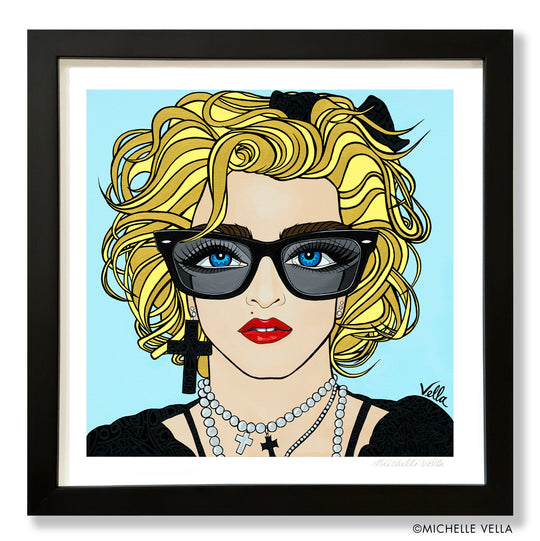 "In my portrait of Madonna, I've sought to distill her iconic blend of boldness and allure that revolutionized pop culture. Her piercing blue eyes are amplified behind the classic black sunglasses, a nod to her timeless mystique and the unapologetic persona she embodies. Her platinum blonde curls cascade around her, a testament to the ever-changing but always striking image she's crafted over the decades. Adorned with an array of symbolic jewelry, including crosses and chains, each piece reflects facets of her complex persona—spiritual, sensual, and unyieldingly strong. The background's soft blue hue contrasts with her striking features and the dark, intricate handwritten lyrics and song titles that make the lace of her attire, all brought to life with my signature wide-eyed aesthetic that invites onlookers to look closer and see the myriad layers of the Queen of Pop. This painting celebrates Madonna as a muse of reinvention, a force of fierce femininity, and an everlasting emblem of the intersection between fashion and music."