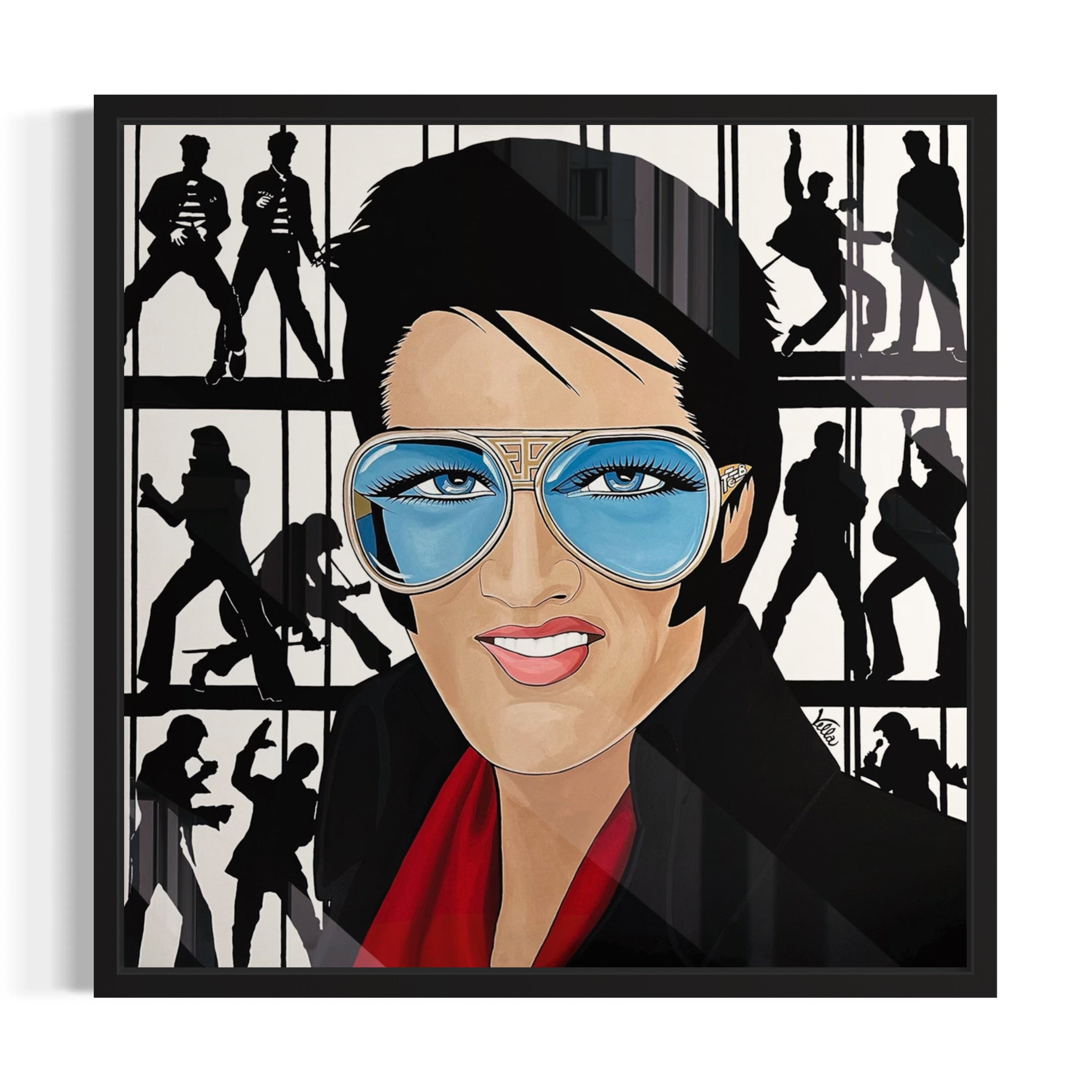 The Comeback - Elvis Presley: "I've immersed myself in his world, watching documentaries that capture the essence of the man behind the legend. One that particularly stood out is "Reinventing Elvis: The '68 Comeback" on Paramount. This film offers a rare, intimate look at Elvis during the making of The Comeback Special, revealing his kindness, humor, and undeniable charisma. It also shows his vulnerabilities and the genuine joy he experienced during this pivotal moment in his career. Elvis was on fire, and the iconic scene with his silhouettes in the background inspired me to capture that magical, electrifying atmosphere in this painting. In preparing for my paintings, I create a digital mockup and combine several photos to get that look I have in my mind and in this portrait I had to include his famous TCB (The Come Back) sunglasses to highlight his eyes in my big eyes style. I'm so proud of how this portrait turned out and I hope to bring a sense of joy and nostalgia to everyone who sees it, just as Elvis’s music has brought joy to millions." ~ Michelle Vella