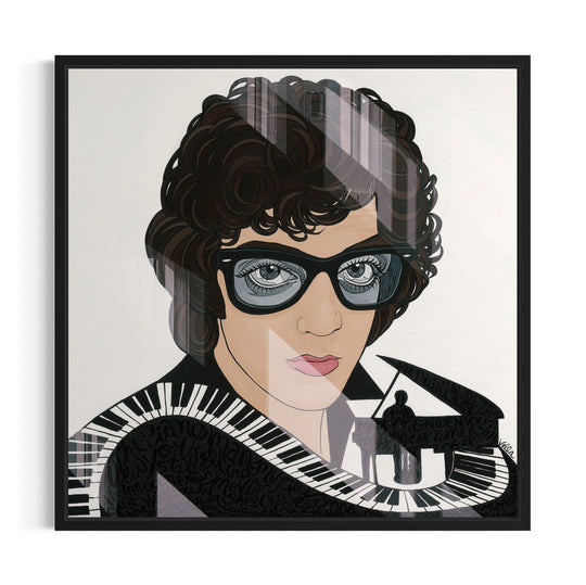 portrait painting of The Piano Man, Billy Joel by Michelle Vella with iconic big eyes, in black and white