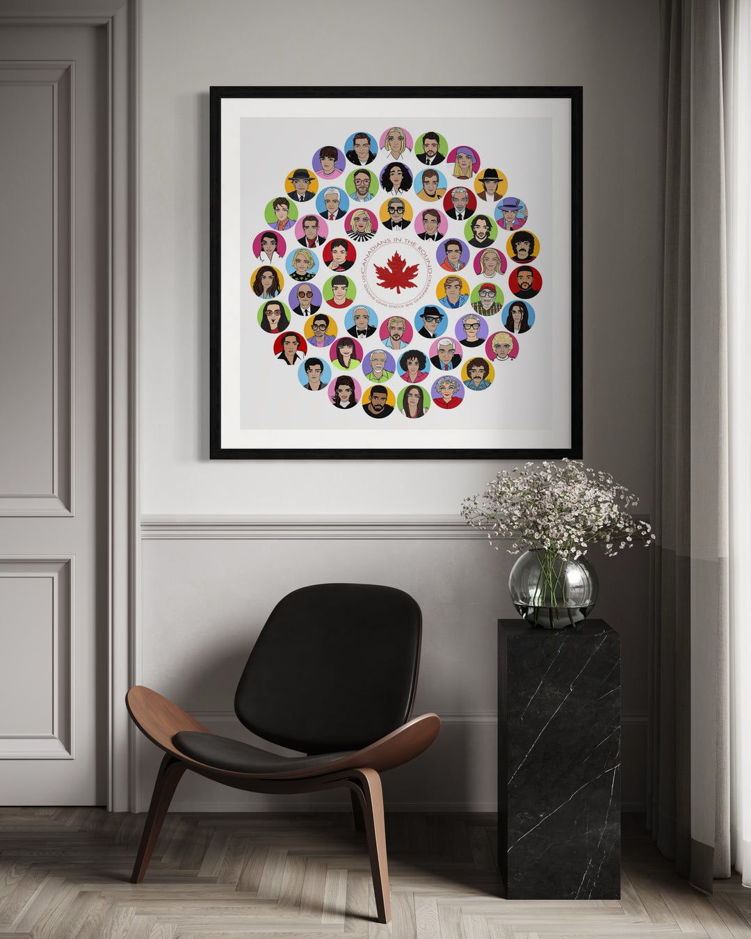 50 of Canada’s most iconic cultural legends, united in one extraordinary artwork. From legendary musicians to beloved actors, comedians, and trailblazers, Canadians in the Round brings my painted portraits together in a single collector’s piece that sparks joy, nostalgia, and pride.